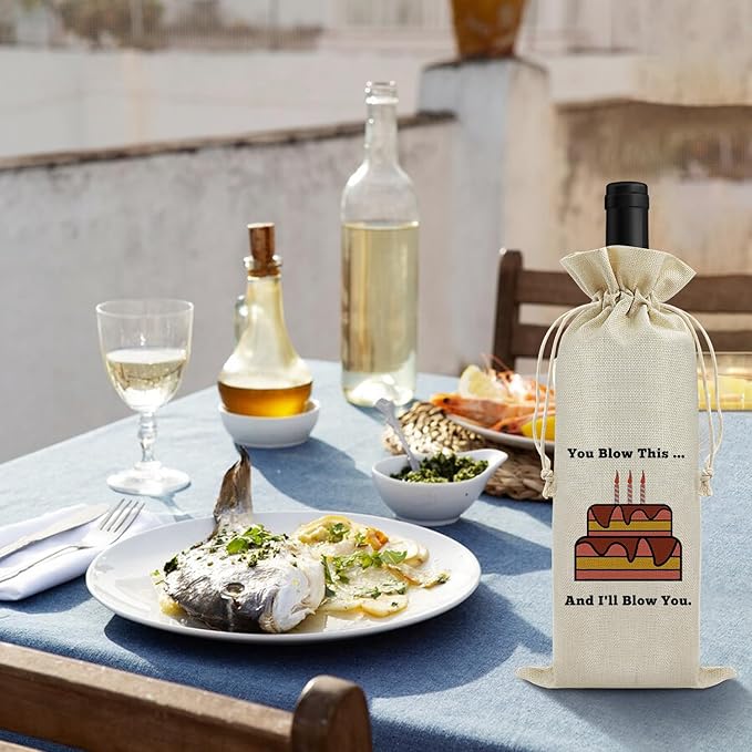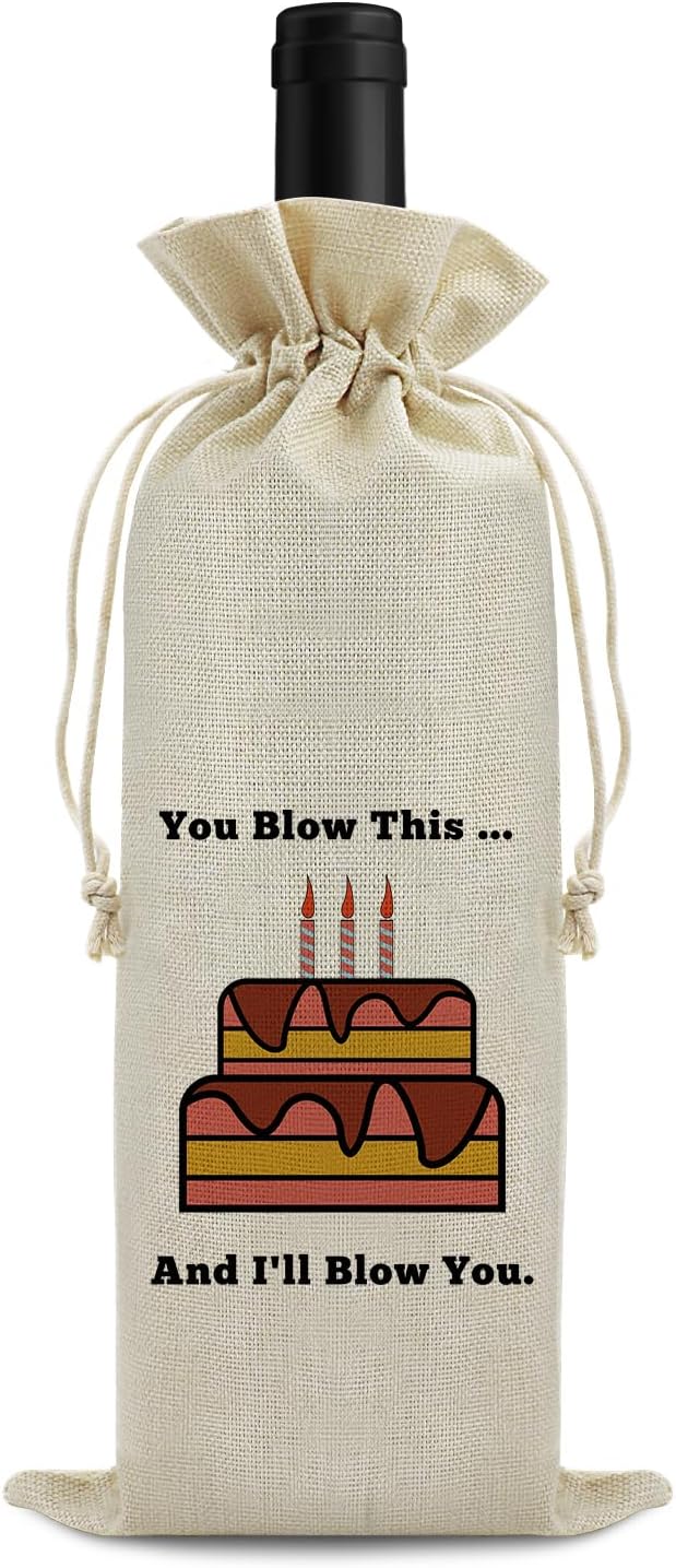 - Celebrating Birthday Wine Bag for you:The size of this wine gift bag is about 36x16cm(14.2 inch*6.3 inch), with a thick hemp rope to easily close and open.The housewarming gift wine bags are made of high quality natural linen fabric material. It can hold a standard 750ml champagne bottle, Burgundy bottle, and wine bottle. can also put other small gifts into the bag. Tighten the drawstring to protect your bottle from being exposed, funny quotes and saying, leaving wonderful memories for you.
