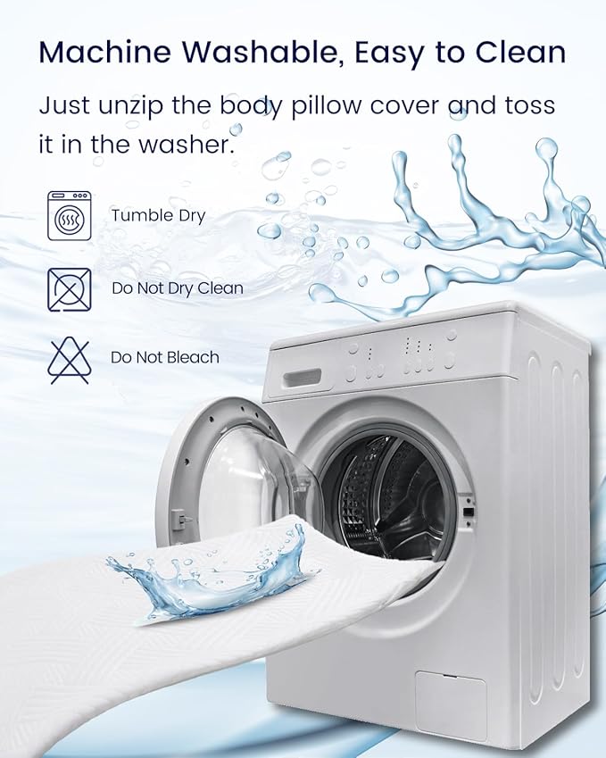 - Easy to Maintain: Keep your sleep environment fresh with our detachable, washable pillowcases.Machine wash in cold water on a gentle cycle and dry on low or no heat. The durable design maintains its cooling properties even after multiple washes. Note: Each memory foam body pillow are vacuum-packed for shipping. Allow 24-48 hours for the pillow to fully fluff up after receiving. If there is any dissatisfaction, please contact us, we will provide you with 24-hour after-sales service