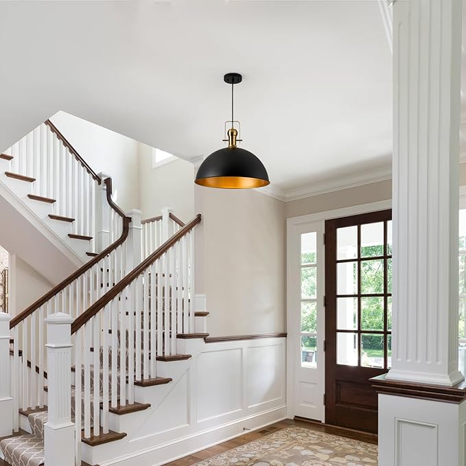 - [Industrial & Vintage Design]: 1-Light industrial farmhouse pendant light fixtures with adjustable cord, mattle black finish featuring retro-style dome shade, this antique pendant lighting is made of sturdy metal construction in black finish and inner gold finish.The vintage pendant lights is ideal for home, dining room, kitchen island, warehouse, entryway, corridor, restaurant, cafe, bar, club, barn, working bench.