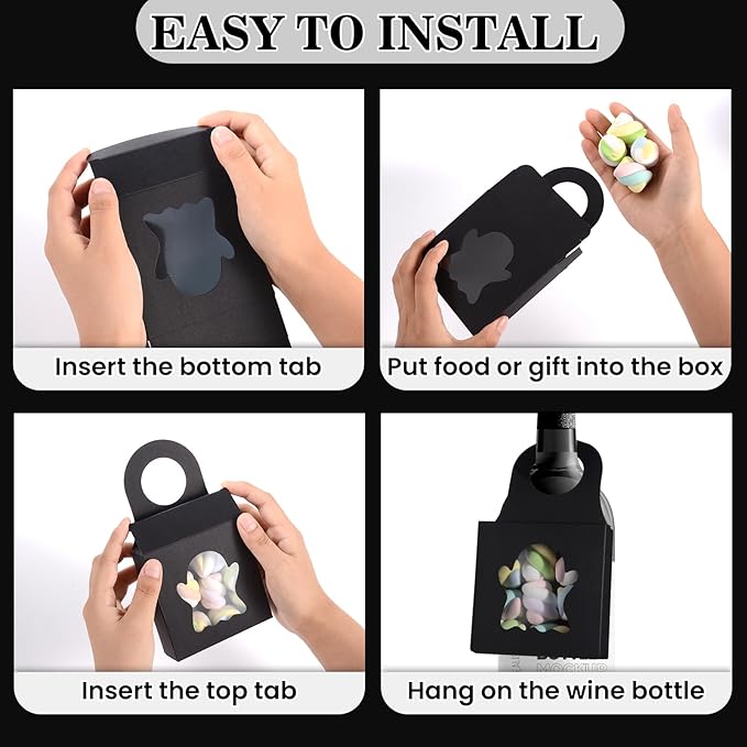- Universal Size - Wine bottle hanging boxes are 3.5 x 3.5 x 1.2 inches / 9 x 9 x 3 cm in size, and the hanging hole diameter is 1.5in / 3.8cm. Thick waterproof kraft paper material makes candy box durable and easily to hang on various size glass bottles such as champagne, prosecco, and also plastic bottles like soda and water bottle.