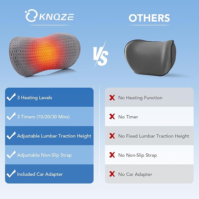 - 【Warranty & Warm Tips】Ideal for car seats, office chairs, recliner chairs, and sofas, our lumbar support pillow is an ideal gift for anyone who sits for long periods. Note that the memory foam may harden in cold conditions and soften in warmth, which is normal and doesn't affect its use. Do not remove the pillowcase to wash, as the back pillow has heating wire. KNQZE offers a 1-year warranty with free replacements for any damage within the first year.