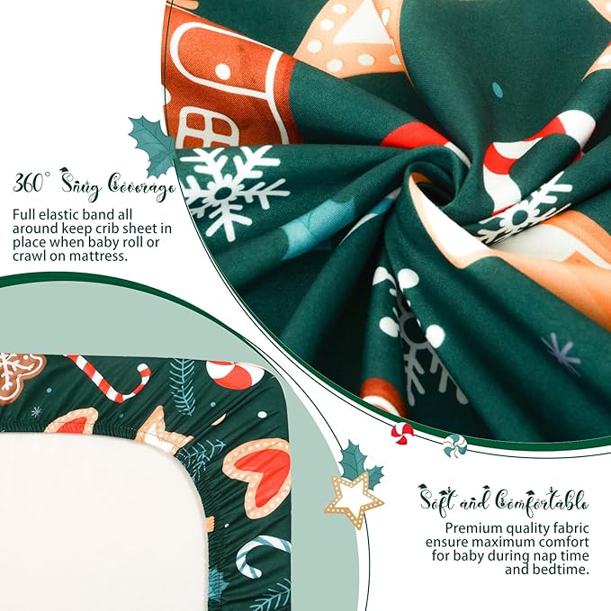 - 【Christmas-Themed Design】: Featuring a cute and colorful Christmas pattern, fitted crib sheet is perfect for both girls and boys, add a touch of holiday cheer to your nursery. The adorable prints of gingerbread, snowflakes and Christmas trees will create a magical and whimsical atmosphere for your little one to sleep and play in. It is a versatile option for parents who are expecting or have young children of different genders.