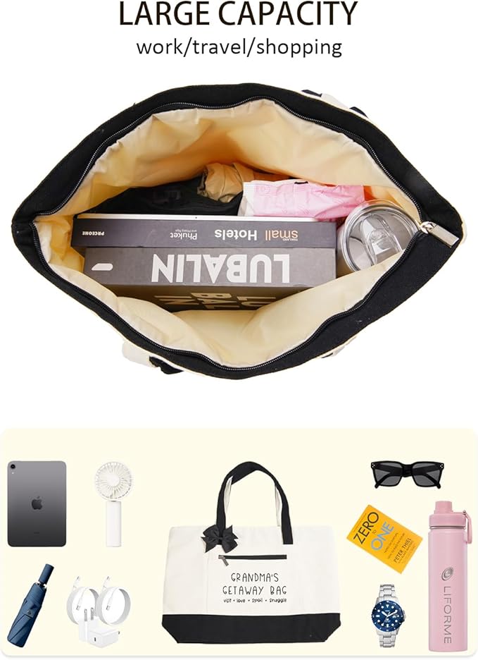 - Large Capacity for Multiple Use: This large size tote bag (17.7" x 13.7" x 3.9") is perfect for Grandma to hold groceries, clothes, shoes, snacks, a laptop, magazines, and other daily essentials. Grandma can take our getaway bag to various occasions, such as work, weekends, beach trips, weddings, bridal showers, vacations, camping, office use, yoga sessions, library visits, and grocery shopping.