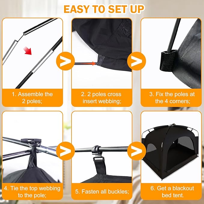 - Easy to Set Up - Quick and straightforward assembly, allowing you to set up or take down the bed tent effortlessly without any hassle. Simply cross two poles and insert them into the bottom sleeves, hang the hooks, and place the mattress inside to complete the setup.