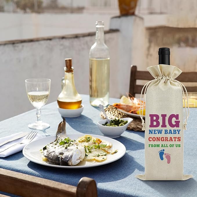 - New Baby Gift: The new baby announcement wine bags printed with "BIG NEW BABY CONGRATS FROM ALL OF US". It is a great gift ideal for new grandma, mom, women, new mom, friends, sister, aunt, best friends, neighbor. A great way to share the happy time with your family and friends.