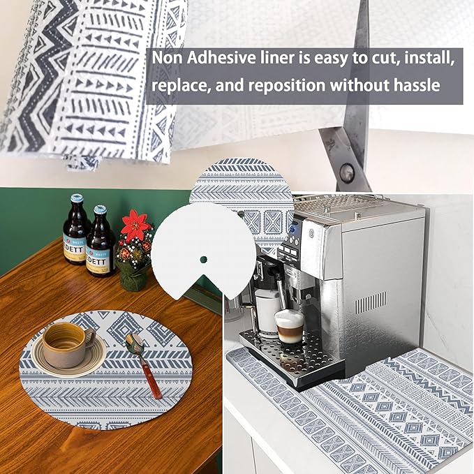 - Premium Material- shelf liners is constructed from a durable EVA (ethylene vinyl acetate) plastic material and features a non-adhesive backing with a good grip so that it stays in place. Easy to clean and waterproof, looks fresh and clean, only requires a damp cloth to quickly refresh any surface you need to keep your cabinets and drawers organized