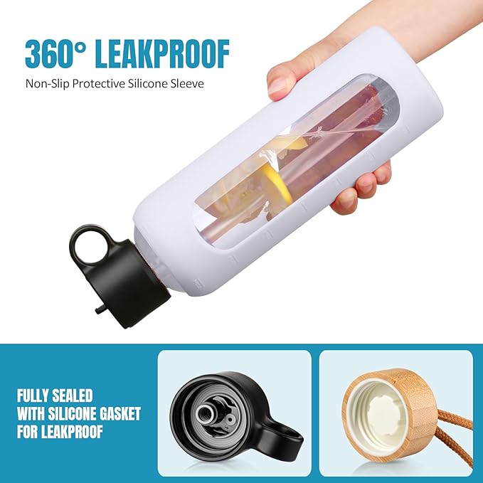 24oz Glass Water Bottle With 2 Lids-Flip Straw Lid, Bamboo Lid, Glass Water Bottle With Silicone Sleeve, Motivational Time Marker, Glass Juice Bottle for Cold Drink,White