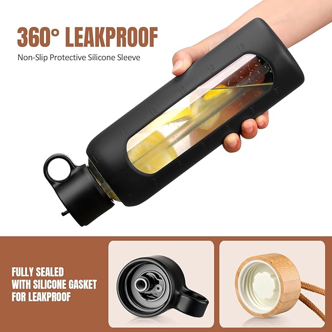 24oz Glass Water Bottle With 2 Lids-Flip Straw Lid, Bamboo Lid, Glass Water Bottle With Silicone Sleeve, Motivational Time Marker, Glass Juice Bottle for Cold Drink,Black
