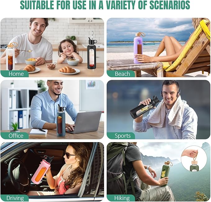 - MULTIPLE OCCASIONS -WINSA glass water bottle with straw is ideal for both daily inhouse or outdoor occasion, such as Home, work office, sports, gym, beach, hiking, camping or driving. Great present option for friends or families on School, Thanksgiving, Xmas, Birthday, Anniversary, etc. Our glass water bottle come with both 24oz and 32oz, each with 8 trendy colors and all have interchangeable 2 lids making this your ultimate drinking companion!