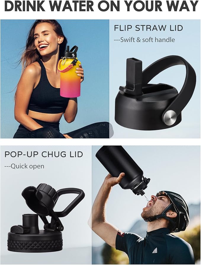 - 2 LEAKPROOF LIDS OPTIONS: This stainless steel water bottles with STRAW LID and AUTO SPOUT LID, both BPA-free, leak-proof and one-hand control design, great car must have things! The pop-up spout lid for easy drinking and seals shut for no leaks when you're on the go. The straw lid makes it easy to enjoy spill-proof sips, and package come with a alternative straw & a straw brush for easy cleaning.