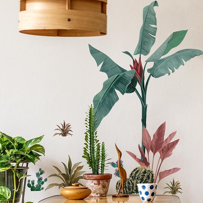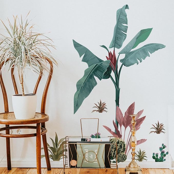 Plant Wall Decals - Stylish Green Leaf and Pink Flower Stickers for Home Decor