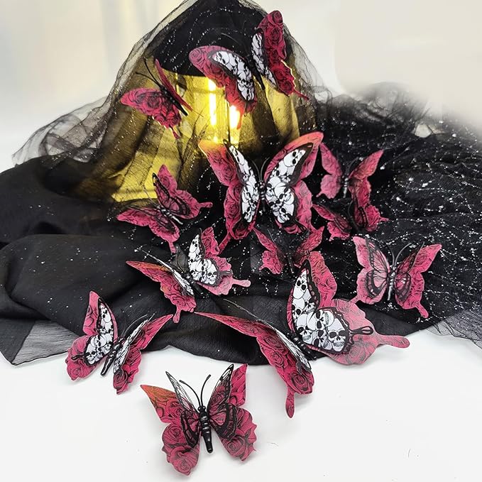 Halloween Wall Stickers 12Pcs Butterfly Wall Decor Red Roses Skull Design Halloween Wall Decorations 3D Butterflys Wall Decals Reusable Wall Stickers Decor for Halloween Home Door DIY Accessories