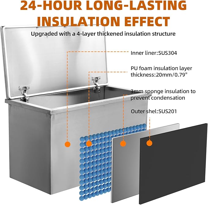 - Stainless Steel Construction: Made from high-quality food-grade 304 stainless steel, this ice chest is durable and easy to clean. The double-layer design and high-density insulating rubber interior keep your ice cool for extended periods.