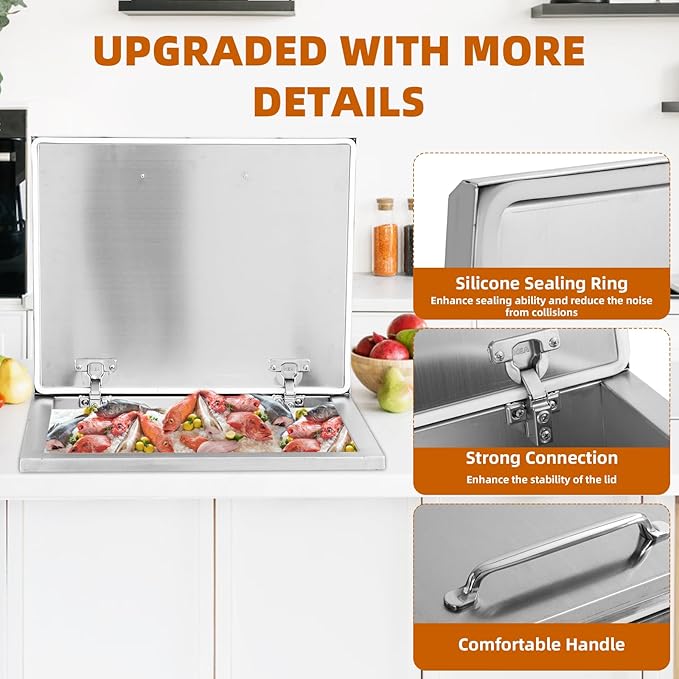 Upgraded Drop in Ice Chest, Stainless Steel Ice Cooler, Commercial Ice Bin with Cover, Outdoor Kitchen Ice Bar, Drain-Pipe and Drain Plug Included, for Cold Wine Beer