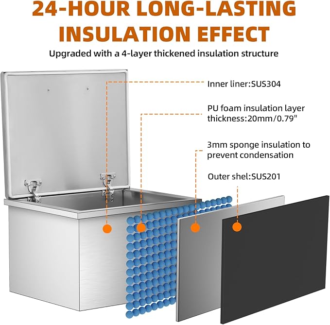 - Stainless Steel Construction: Made from high-quality food-grade 304 stainless steel, this ice chest is durable and easy to clean. The double-layer design and high-density insulating rubber interior keep your ice cool for extended periods.
