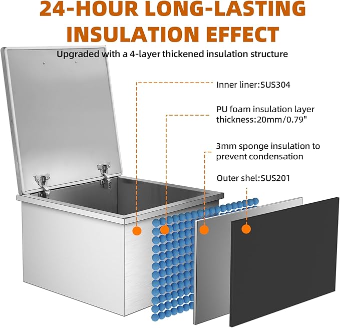 - Stainless Steel Construction: Made from high-quality food-grade 304 stainless steel, this ice chest is durable and easy to clean. The double-layer design and high-density insulating rubber interior keep your ice cool for extended periods.